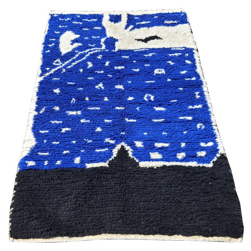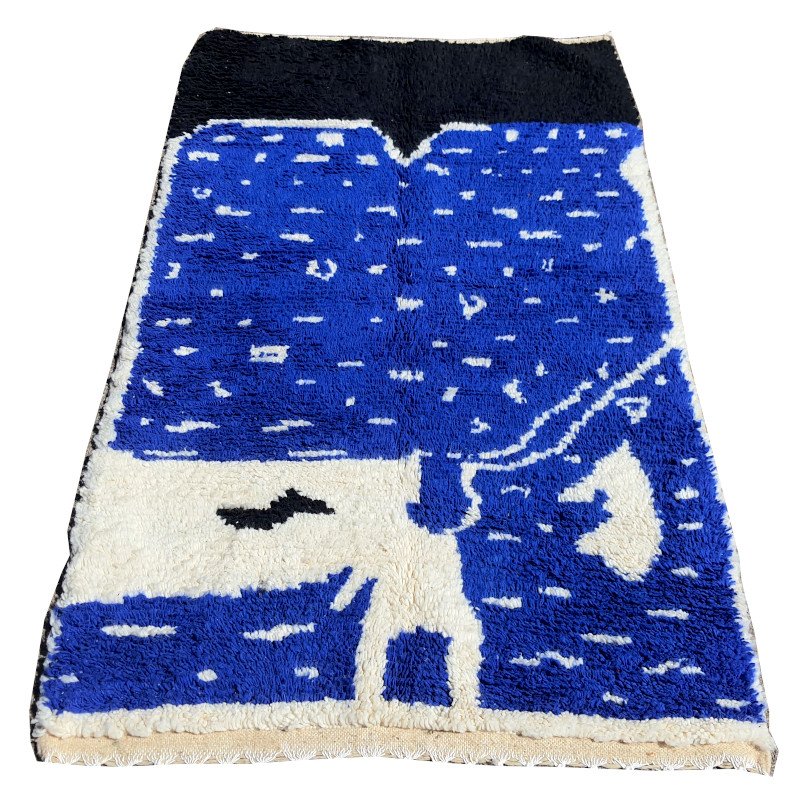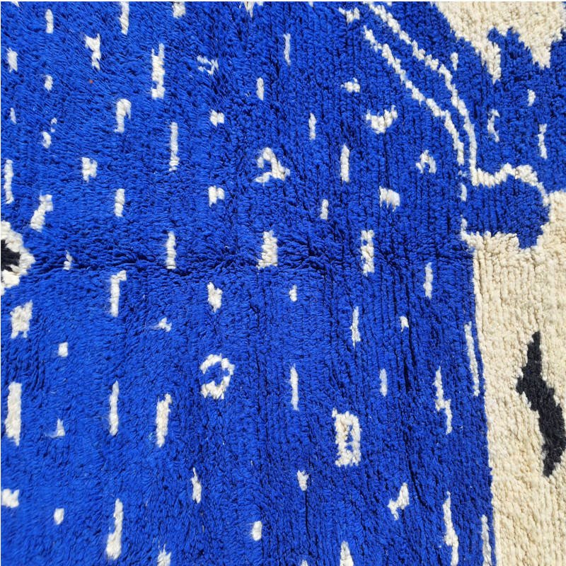 Add bold color and artistic expression to your home with this blue Moroccan rug. Featuring abstract Berber patterns in deep blue and ivory tones, this handmade wool rug brings a modern yet authentic touch to any interior space.